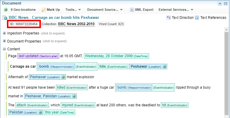 Sintelix cross-references location names in ingested documents with an internal database, then assigns geocoordinates (latitude and longitude) to each location. With the text reference search facet, you can search for documents that contain references to locations within a specific geographic area. For example, you may want to find documents that reference locations within a 500 km radius of a particular capital city, or a disease outbreak or a war zone. For more information see Search geocoordinates.