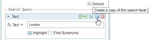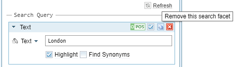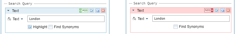 By default, search facets that you add to a query are included in the query, as indicated by a tick in the box beside the POS / NEG icon. To exclude a search facet from a query without removing it, clear the box.