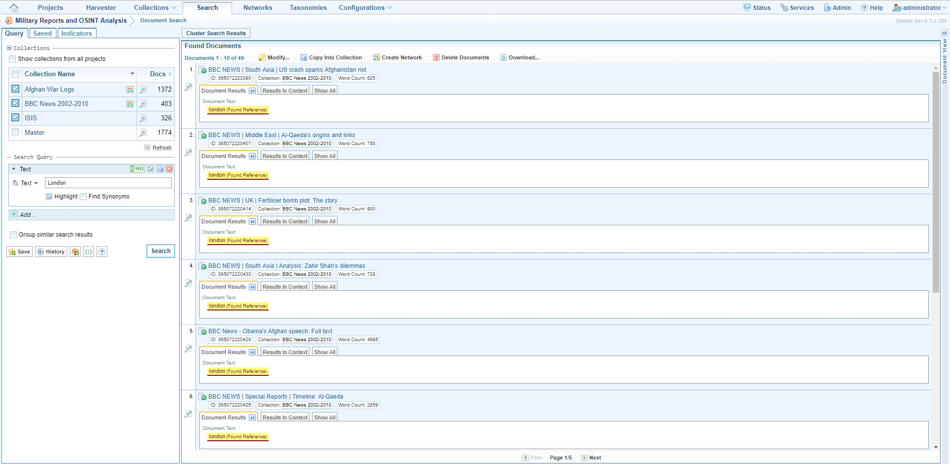 Sintelix has a powerful set of search capabilities, with a wide range of search facets available, so you can run multifaceted searches to refine your results. This topic will show you how to search within a single collection Once source data has been ingested, the resulting Documents are stored in a Collection. Once Documents are stored in a Collection, you can browse, search and edit Documents. Only text-based Documents is stored in Collections, not the original source files., and across multiple collections, using each facet.