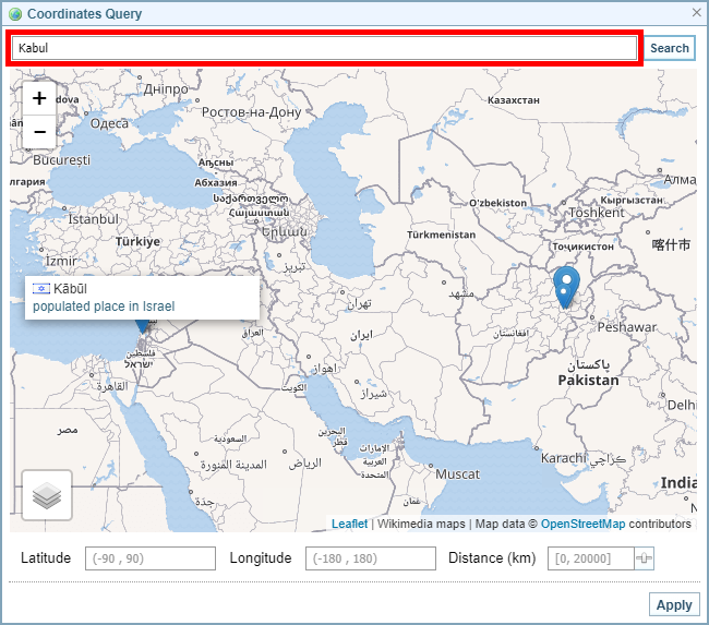 - To locate a town, city or country as a reference point, enter the name in the field above the map, then click Search. A blue map marker is placed at the location that matches. If several locations have the same name, a blue map marker is shown for each location. The largest marker indicates the location with the largest population. Hover over the markers for more details. To select a location, click on the map marker. The map marker turns red to indicate that it has been selected.