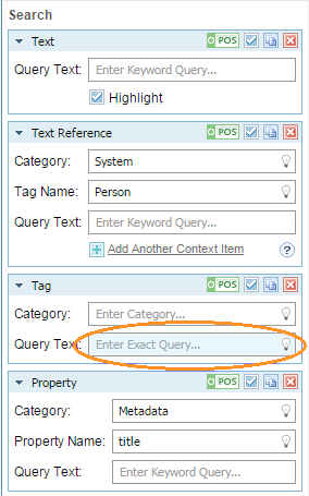 Sintelix offers two modes of search - exact and key word - they have different capabilities (key word search is more powerful). Key word search fields have a white background, while exact search fields have a blue background. In the image below you can see that the Query Text for a Tag search has a blue background, indicating an exact search.