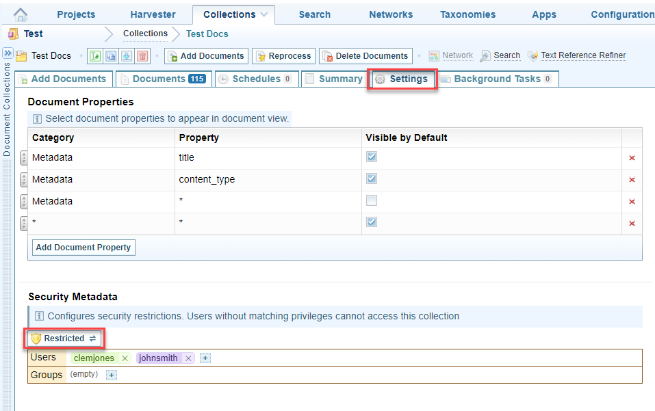 Open a Collection, and select the Settings tab to view the Security Metadata for the collection.