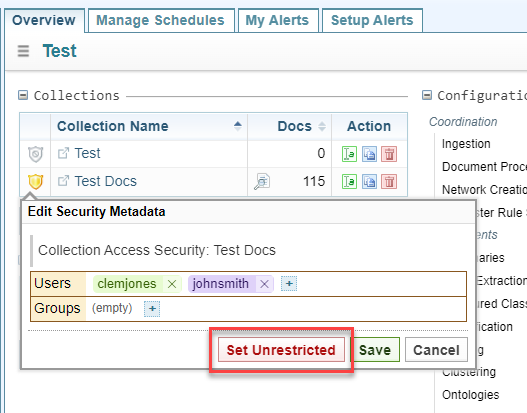 To remove all users and security groups to make the Collection/Network unrestricted: