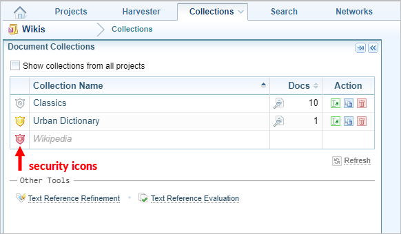 Selecting either the Projects or Collections tab to access the list of collections, and click on the security icon next to the Collection name.