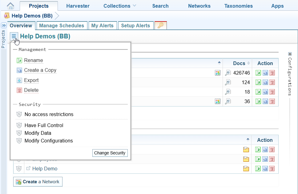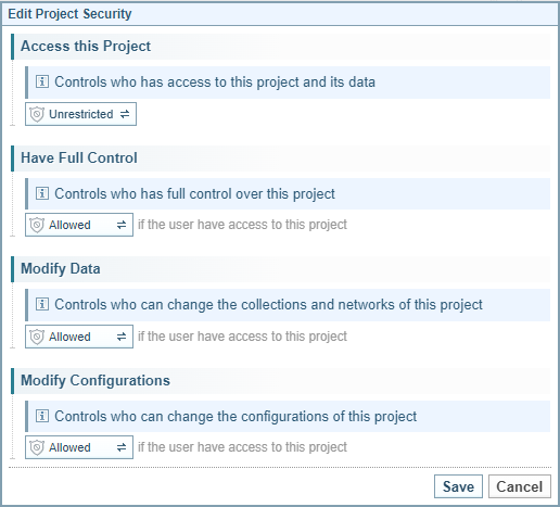 See Manage Project Security to understand how security is managed for projects, collections and networks under the default Sintelix Security Model.