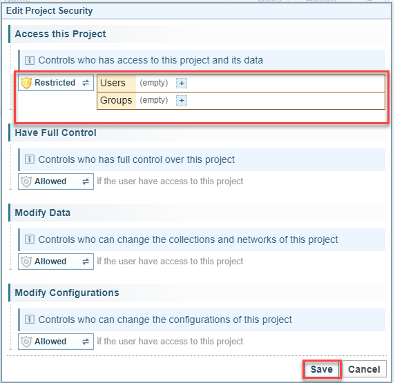 Access to Projects, Collections and Networks can be assigned to individual users or to Security Groups. When access is assigned to a Security Group, a user has access when they are a member of that group.