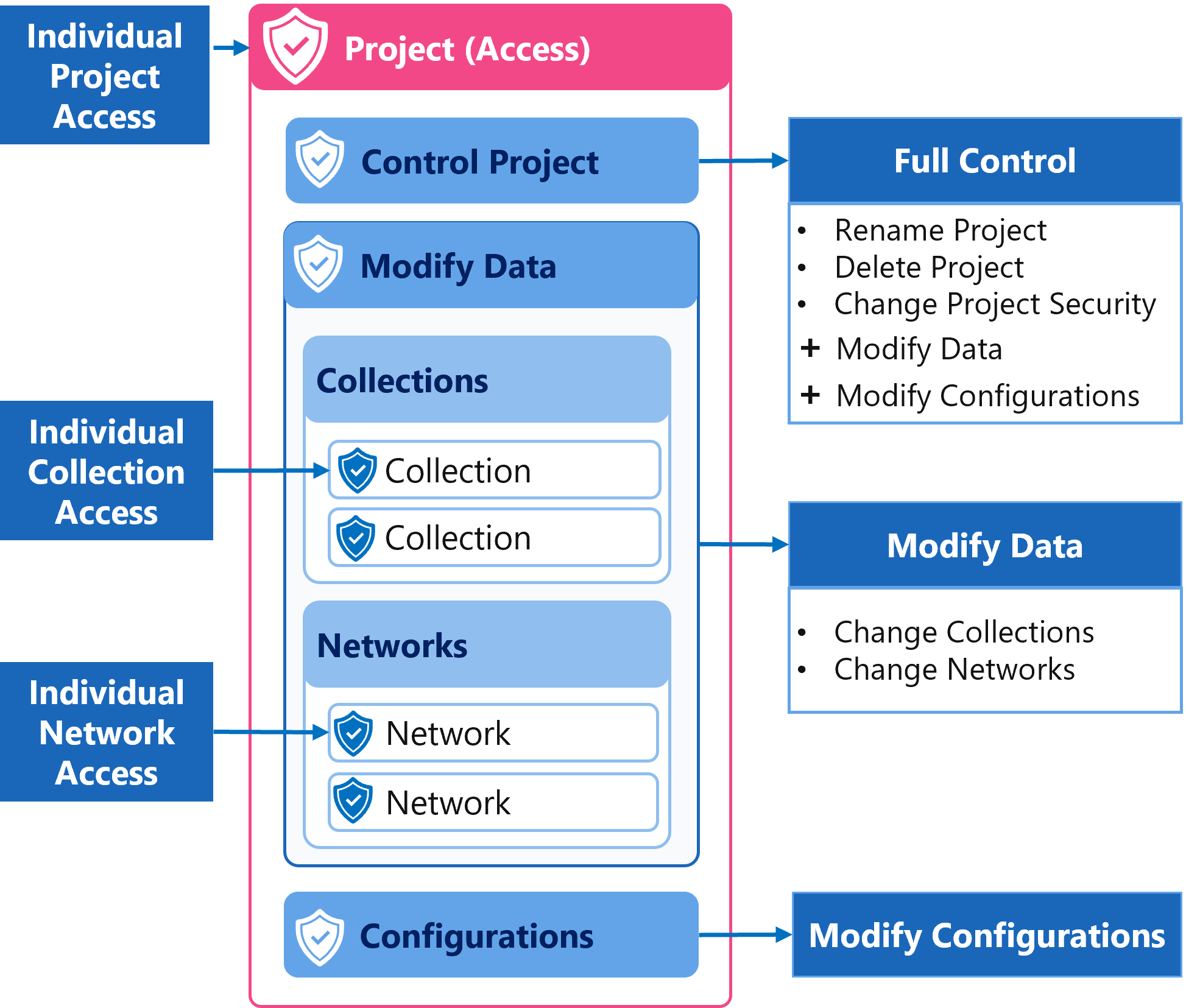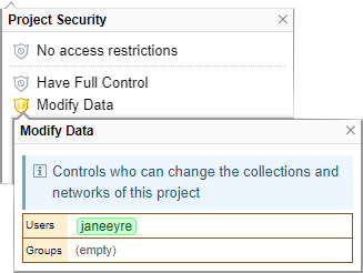 Access to Projects, Collections and Networks can be assigned to individual users or to Security Groups. When access is assigned to a Security Group, a user has access when they are a member of that group.