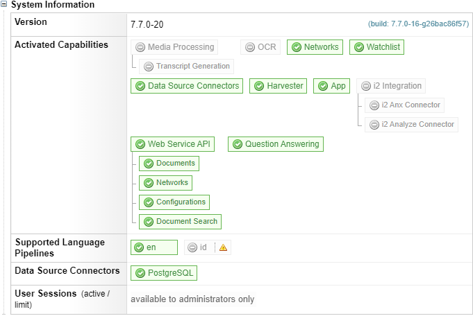 The Language Pipelines supported, installed and licensed to perform Entity Extraction on different languages. (Enhanced) displayed after the language name indicates the Entity Extraction enhanced mode is installed. For example, |