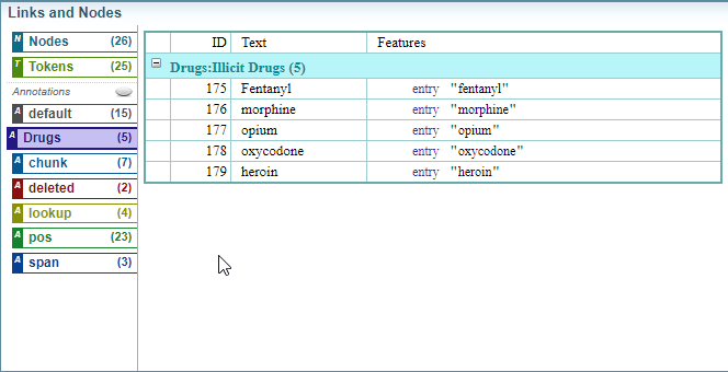 Below is an example of a simple wordlist in a dictionary, where each word listed will be annotated as an Illicit Drug with the label Drugs, but will not be highlighted in the document.