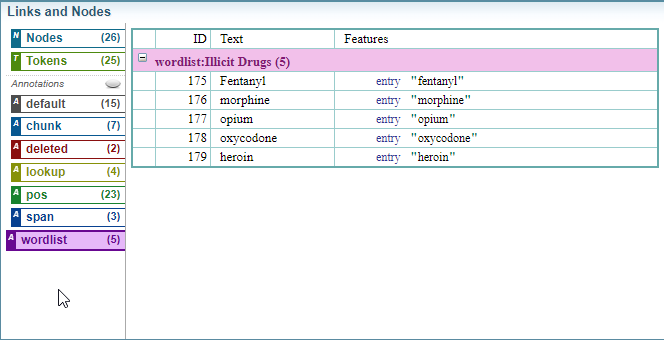 Below is an example of a simple wordlist in a dictionary, where each word listed will be tagged as an Illicit Drug.