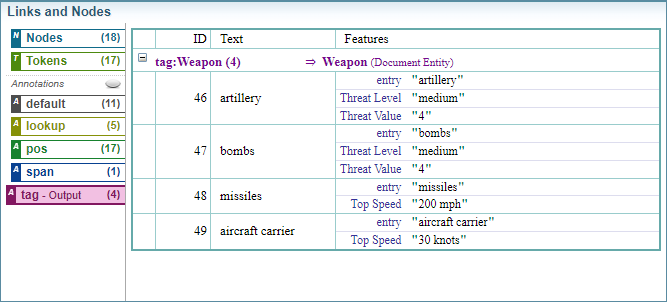 This example shows a column definition with three columns: text - for the dictionary entry and two features "Threat Level"and "Threat Value".