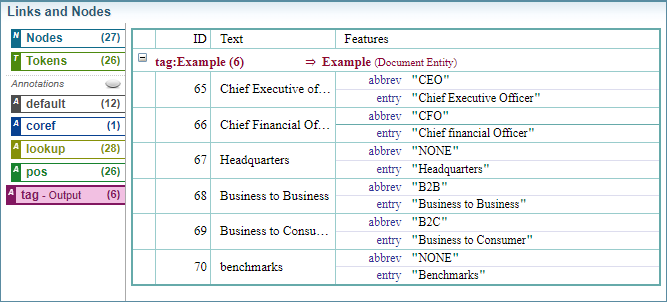 This example also shows how you can set a default value for the columns. In this example, the feature "abbrev" has a default set to NONE. The entries benchmark and Headquarters do not provide a value for the abbreviation, so the default value of NONE is applied.