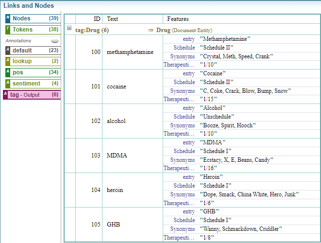This example shows a column definition with four columns: text - for the dictionary entry and three features "Schedule" and "Therapeutic Ratio" and "Synonyms".