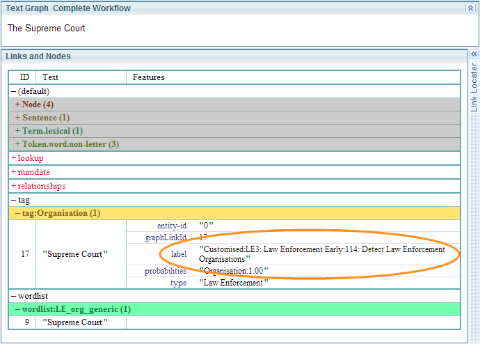 This rule triggered in the example below and the label trace shows up as a feature of the Organisation "Supreme Court":