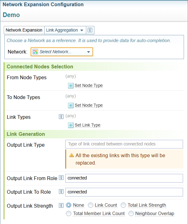Output Link Strength: Choose the type of aggregation you want to calculate and include as the Link Strength for the link (see Link Strength above):