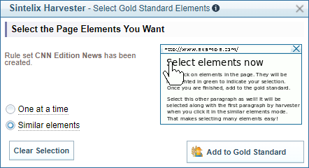 when prompted, click to select and unselect elements on the web page to harvest and then select the Add to Gold Standard button, which will add your first document to the Gold Standard Collection.
