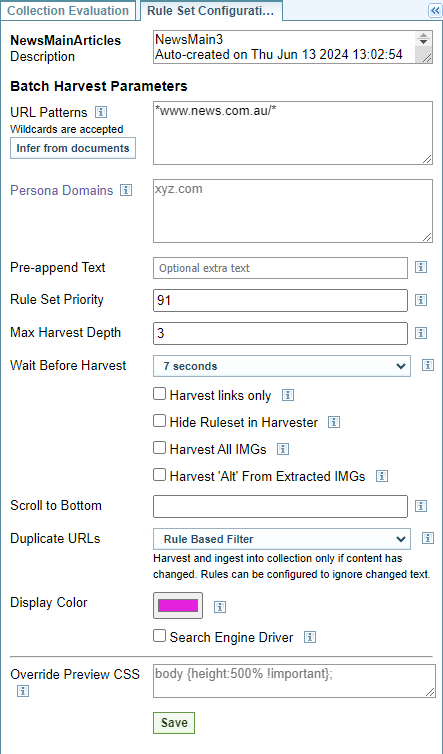 This is used by Sintelix to determine which Rule Set to apply to which web pages based on the web page URL. Selecting will populate this field with URLs found in the Gold Standard Collection. Enter the domain or URL patterns you want the rule set to harvest. If the rule set is for a specific domain, enter the domain, using wild cards if necessary, for example *nytimes.com* If the rule set is more generic, enter specific domains and/or parts of URLs, using wild cards to make them as generic as possible. For example. *.*blog*.com* *.*news*.com* *.*post*.com* *.*press*.com* *.abc.* */article* */news* */story* |