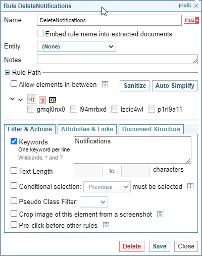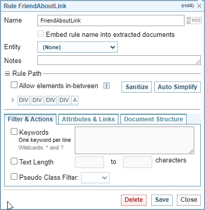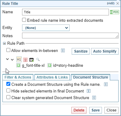 The Rule Header and Rule Path sections are always visible. Advanced features are organised on three tabs: Filter & Actions, Attributes & Links and Document Structure.