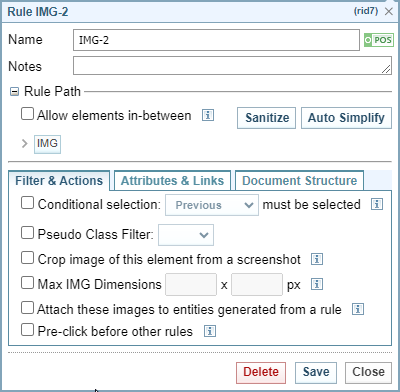 Images (from IMG tags only) can be grabbed and attached to entities created from other rules before or after. This lets you create a rule that associates a profile picture with a person to be viewed in a Sintelix network.