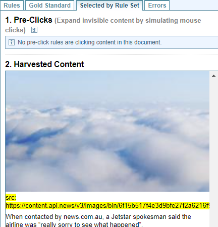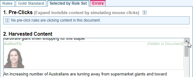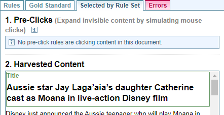 For example, there is a 'Show more' button on a web page. In the rule set that selects this button the Pre-click before other rules option has been selected. The button is automatically clicked before harvesting begins so that the additional content is shown and can be harvested.