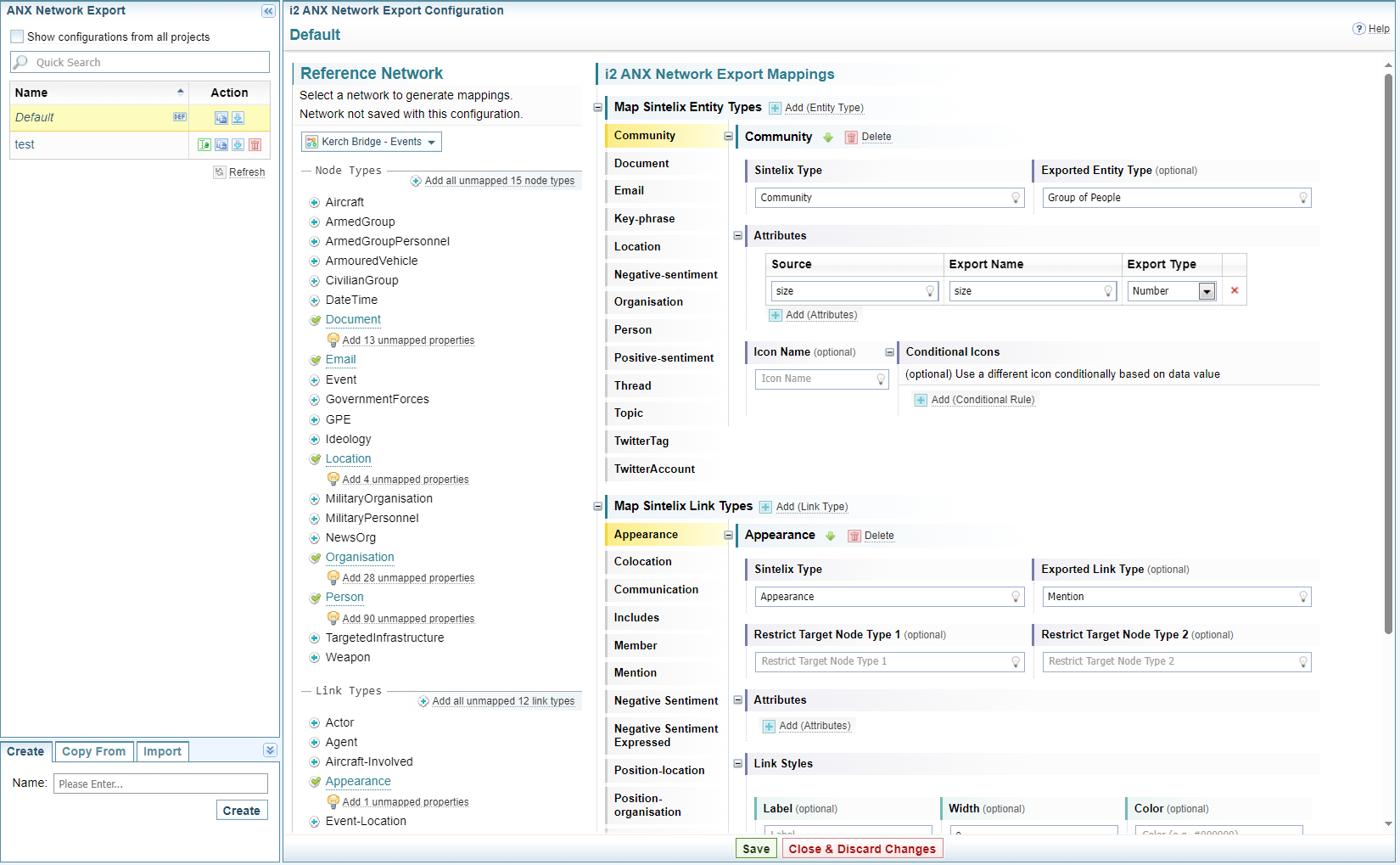 The ANX Network Export configuration allows you to define the Network entities, links and attributes to be exported, and can be matched with the i2 Network entities and links.