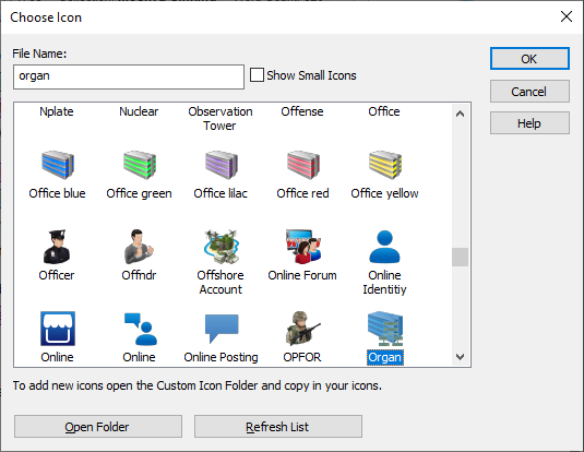 entity, add the i2 Icon name (if different to the existing Entity Type set icon identified above) in the Icon Name field