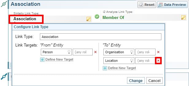 - Target types cannot overlap. For example, it was not possible to leave the Association link to be from Person to both organisation and Location, and create a second link type Association to Location, because links that are Person to Location would match both definitions.