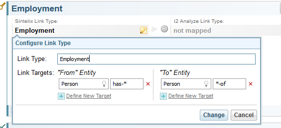 In this example, an Employment link is between Person and Person, so Entity Types do not imply direction. However, if the two roles are of pattern ‘lawyer-of’ and ‘has-lawyer’, as is typical for Sintelix network links, then patterns ‘*-of’ and ‘has-*’ can be used to define direction.