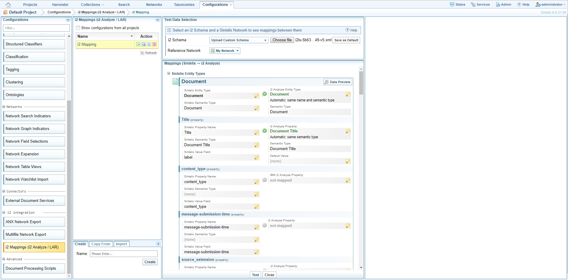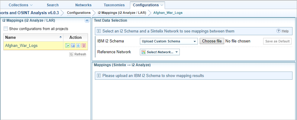 Once you have created a configuration you can test it using different networks and different i2 schemas. Both the Sintelix network and i2 analyse Schema can be changed at any time and the i2 Mappings configuration will remain valid.