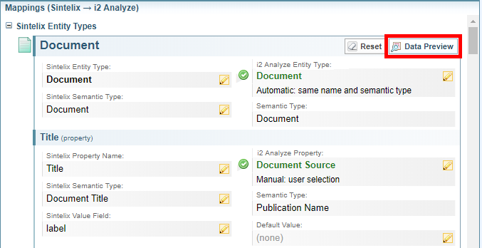 Each Sintelix entity has a name and a semantic type A term used when mapping a Sintelix network to an i2 schema to describe the type of information an entity represents, for example, Document, Gender, Organisation, Relationship Type or Latitude.. Automatic mapping attempts to match the name and semantic type (first both, then either) with i2 entities. If exactly one i2 entity matches, automatic mapping will map to that entity type.