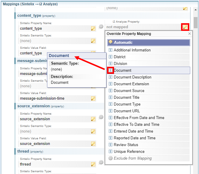 Once a Sintelix entity is mapped to the correct i2 entity, properties need to be matched. The process is identical to entity matching: if the automatic mapping is not your intended mapping, either force the correct property by selecting it from the list, or modify the semantic type and/or property name to influence the automatic matching.