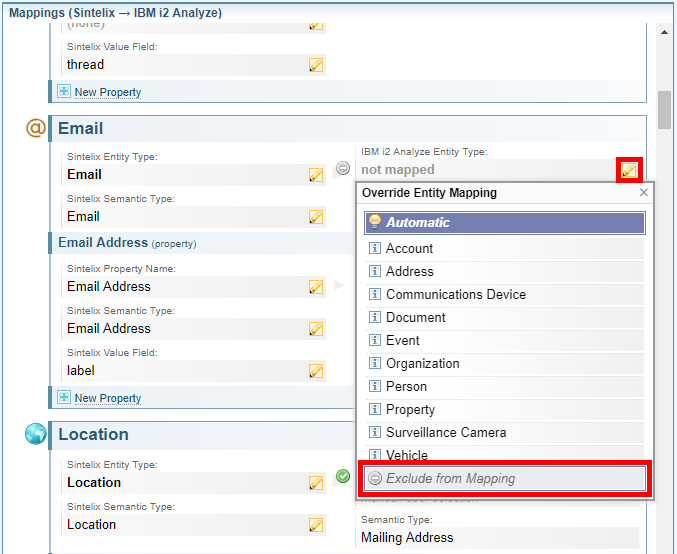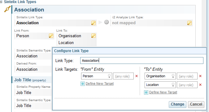 - To influence the mapping by matching the semantic type note the semantic type of the entity type you chose, close the list of i2 entities then click in the field under Sintelix Semantic Type. Enter the semantic type that matches your intended mapping then click Change.