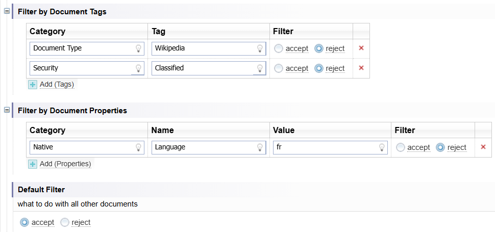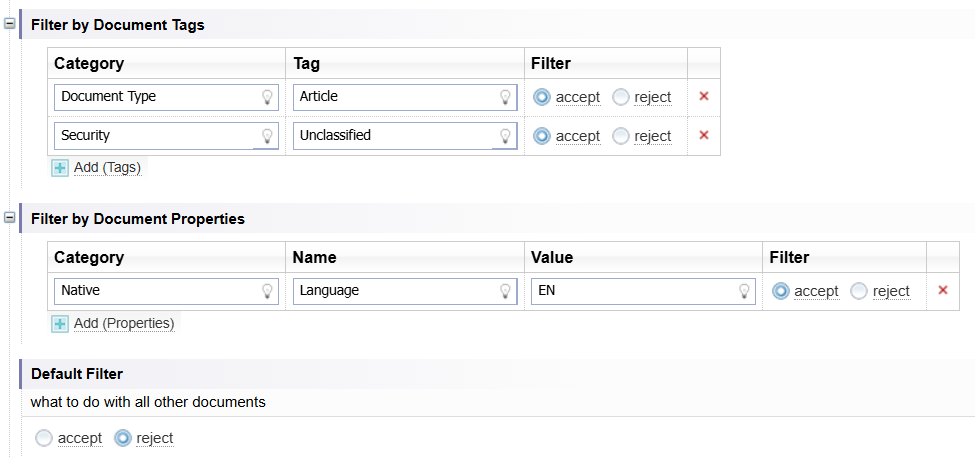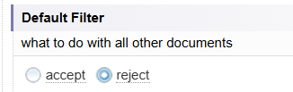 The Default Filter determines what happens to documents which have not met the filter criteria for Document Tags and Document Properties.