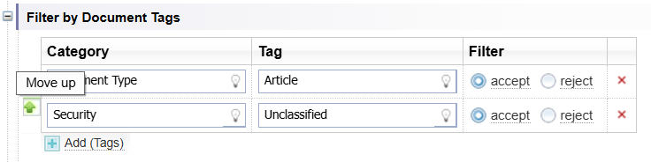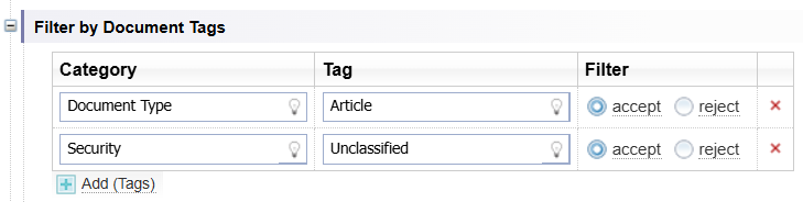 In this example Documents with a Document Type Tag of Article and a Security Tag of Unclassified will be included in the Network.