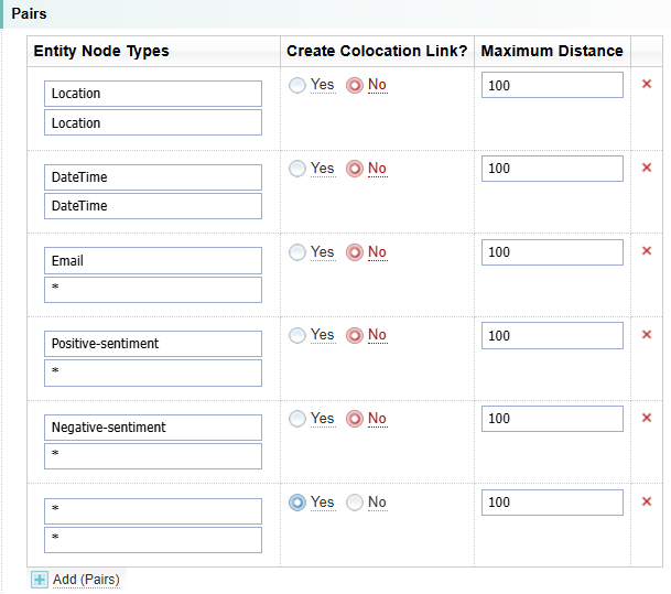 An alternative approach is to enter the entity pairs you want to identify and enable colocation links for those pairs and then disable all other colocation links.