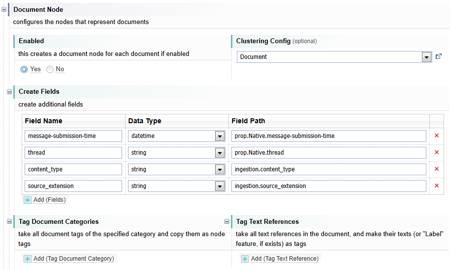Nodes - defines the nodes (document nodes and entity nodes) to include including their features, fields and clustering configuration.