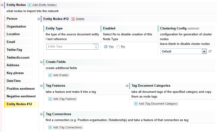 The default Network Creation configuration has several entity nodes already pre-defined in the Entity Nodes section, for example, Person and Organisation. You can add, modify or remove Entity Nodes.