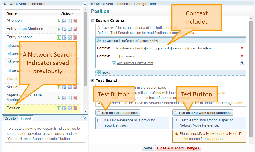 These are created in Search as a saved search of type Network Search Indicator. From the configuration page the Context entries can be edited. Two buttons are available to allow the Network Search Indicator to be tested in search. These transfer focus to the Search page.