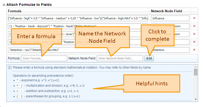 - Fields that are calculated from the values of other Cluster Node Fields with a selection of mathematical operations and functions available for use.
