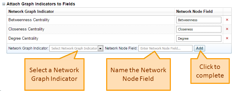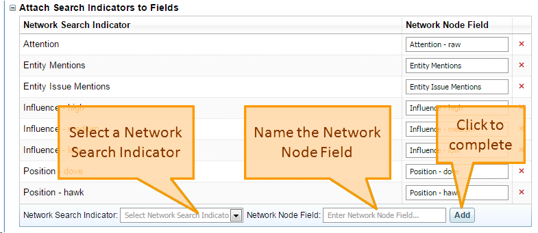 The Attach Search Indicators to Fields section allows us to quickly define a Node Field name and associate a Network Search Indicator to it as the source of the Fields' value.