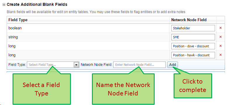 Network Field Selection configuration allows us to define extra fields that we would like to store on the node. We use Network Table View configuration to define a view with which we can see the extra fields in the Network View. We use the Generate Fields button in the Network View to create and populate the fields.