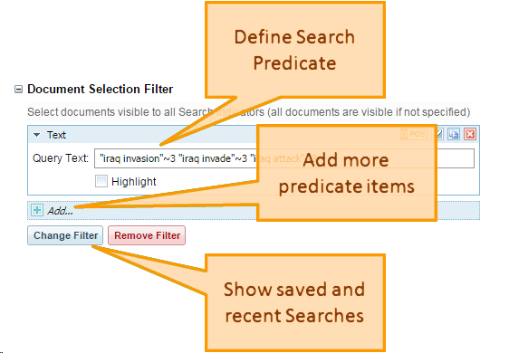 The Document Selection Filter allows us to define a search predicate that will be used to limit the number of documents that will be searched when evaluating the Search Indicators. By default, all of the documents belonging to the Network's collections Once source data has been ingested, the resulting Documents are stored in a Collection. Once Documents are stored in a Collection, you can browse, search and edit Documents. Only text-based Documents is stored in Collections, not the original source files. will be searched.