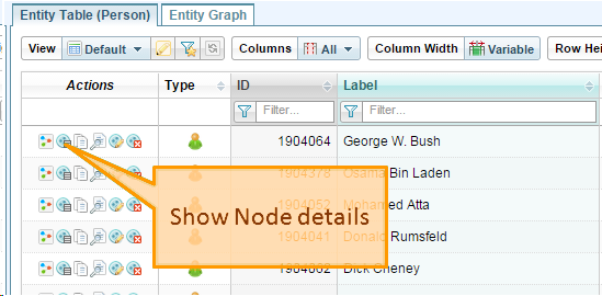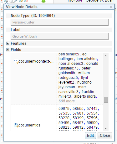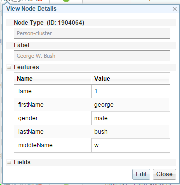 Clicking this action brings up the View Node Details dialog that by default displays the Node ID, Type, Label and Features. The Fields are displayed by expanding the Fields section. There are a set of default Fields created for every node that define the Node's proveNaNce (including document ids and reference locations).