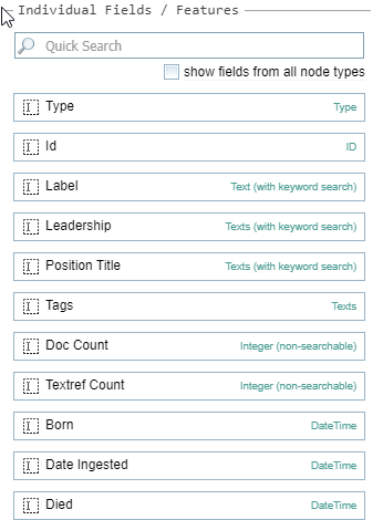 When you select a Network and Node Type at the top of the palette pane, the fields and features associated with that Node Type are created as Data Fields components listed in the Individual Fields / Features section to make it easy for you to add data to the Custom Template.