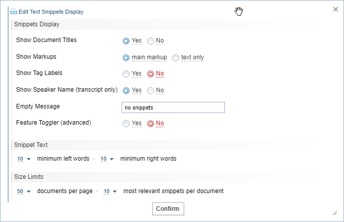 | Snippet Text | You can choose how long to may the document excerpt by choosing the minimum words to the left and right of the text snippet. |