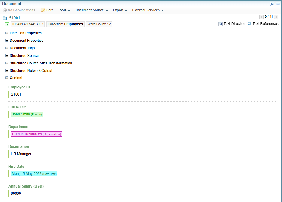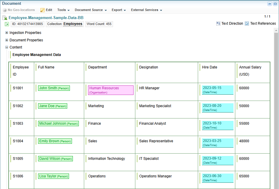 When this Excel spreadsheet is added using unstructured Ingestion, the file is ingested as a single document. You can see the names have been captured as Person, but other information has not been reliably extracted. Additional scripts are required to extract valuable information.