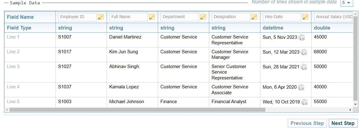 The Sample Data section displays a selection of the data contains in the Sample Data file. You can change the number of lines shown in the sample data from the dropdown on the right.