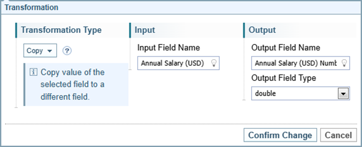 The Copy transformation converts a field into a different datatype, for example, string to double.