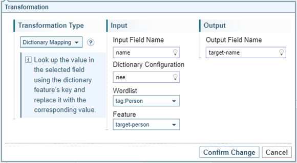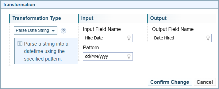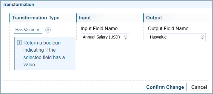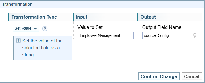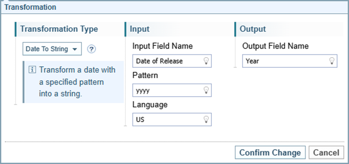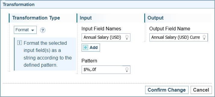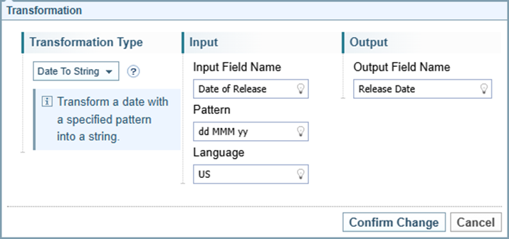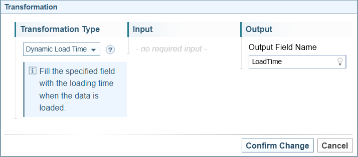 Opens the Transformation dialog to create a new transformation rule. The options displayed on the dialog varies depending on the type of transformation selected. |