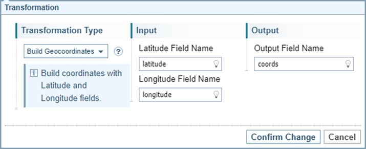 Build Geocoordinates - combine separate latitude and longitude values into a single geocoordinates value.